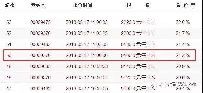 2017-535地塊掛牌期間有4家房企報(bào)名,最高報(bào)價(jià)7620元/㎡,折合樓面價(jià)7257元/㎡,溢價(jià)率0.8%。表面看起來(lái),這場(chǎng)土拍應(yīng)該會(huì)很平靜,從上圖可以看出,在第50輪的時(shí)候,折合樓面價(jià)已達(dá)8724元/㎡,刷新綠城在4月2日創(chuàng)下的地王紀(jì)錄(8720元/㎡),成為德清新地王