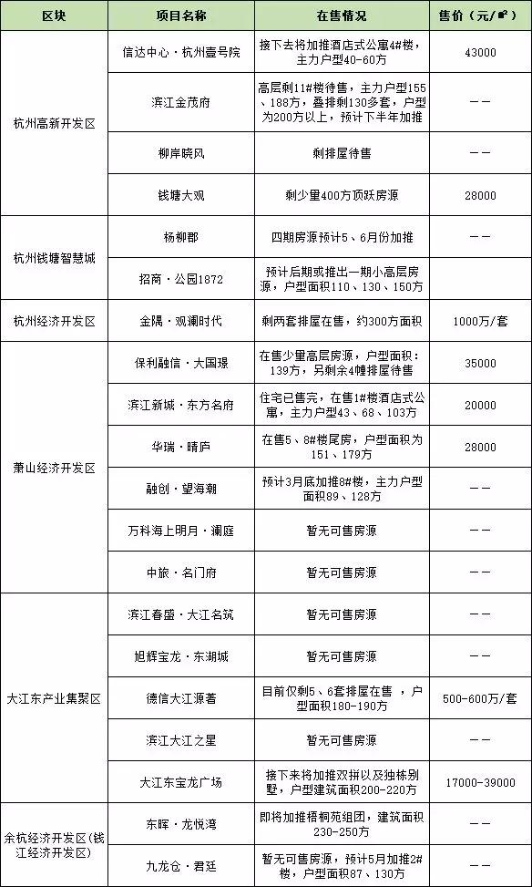 另外,余杭經(jīng)濟(jì)開(kāi)發(fā)區(qū)也有兩個(gè)在售項(xiàng)目,東暉·龍悅灣即將加推梧桐苑組團(tuán),建筑面積230-250方;九龍倉(cāng)·君廷預(yù)計(jì)5月加推2#樓,戶(hù)型面積87、130方。